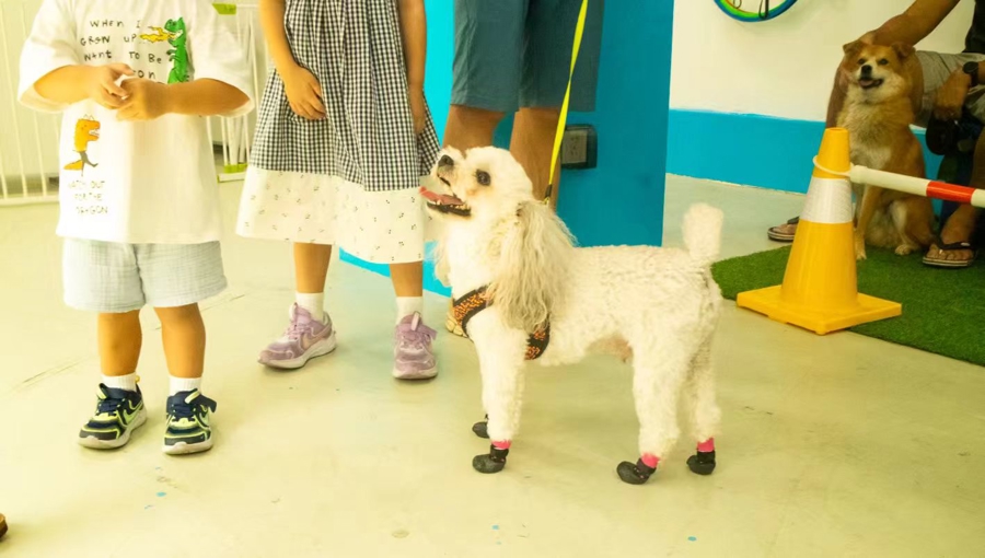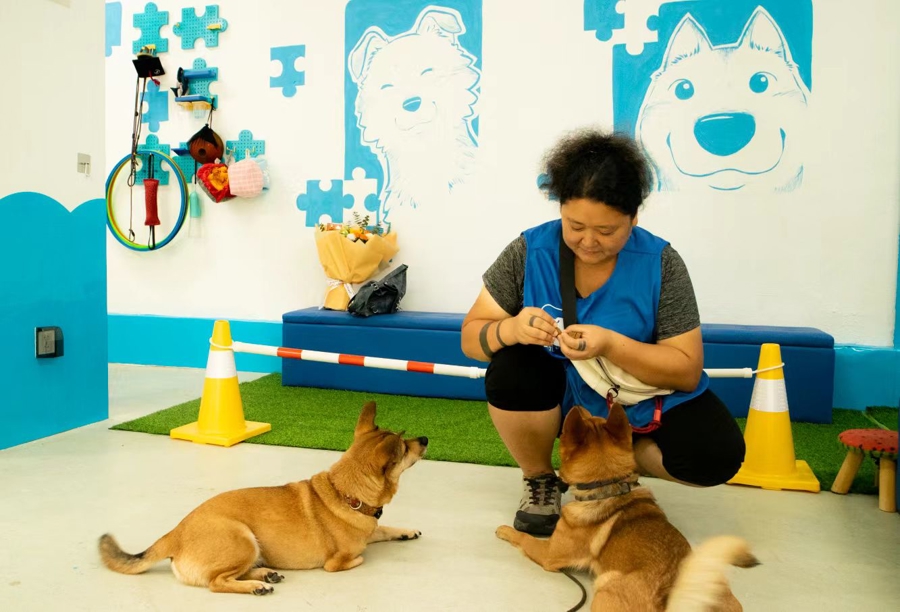Elisa认为,和人一样,狗也要学会“社会化”。在DOGLOGIC,Elisa切了几片狗食,教客人如何用指令指挥狗狗下蹲、转圈、击掌、绕开障碍物等。面对客人毫不犹豫的投喂,她会出言制止:“你看,你在宠坏它。”更多时候,Elisa鼓励客人们在小狗完成任务后再给予奖励。