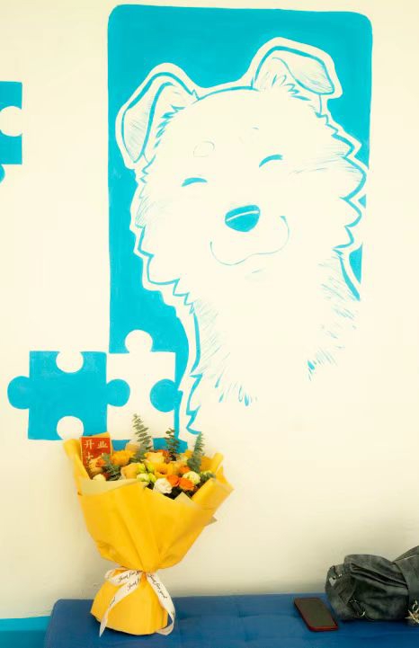DOGLOGIC的墙上,蓝白为主色调画着3只形象活泼可爱的小狗。它们都是Elisa收养的爱犬。3只小家伙都是中华田园犬,前爪残疾的琵琶年龄最大;其次是大黄,Elisa形容它“非常甜美”;而乐乐是最新加入的伙伴。