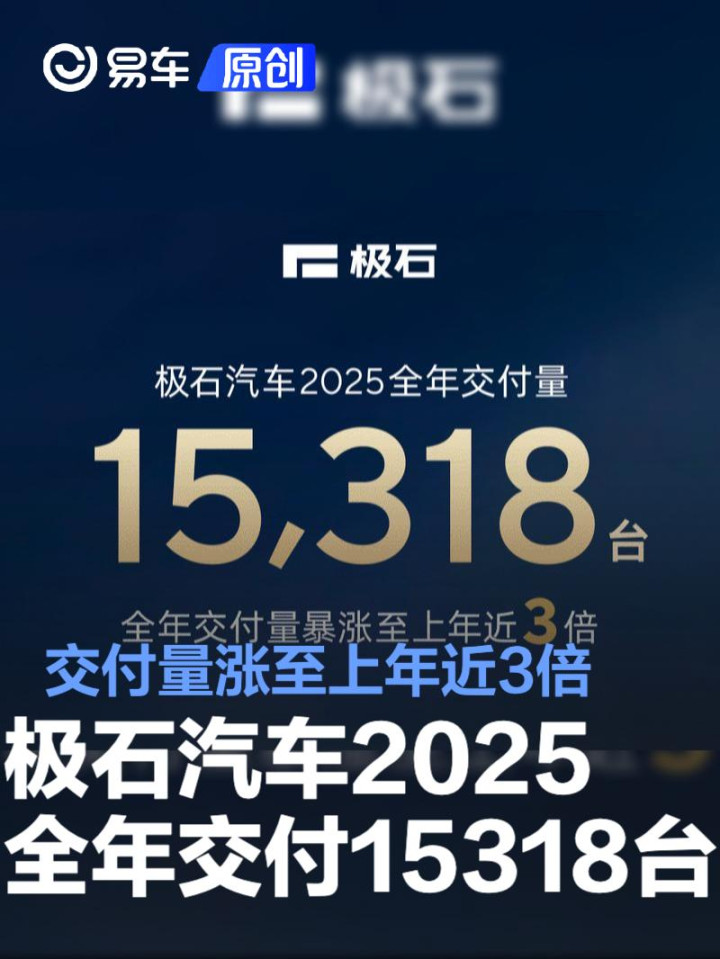 易车讯日前,极石汽车官方公布最新数据。2025年,极石汽车全年交付量15318台,全年交付量暴涨至上年近3倍。